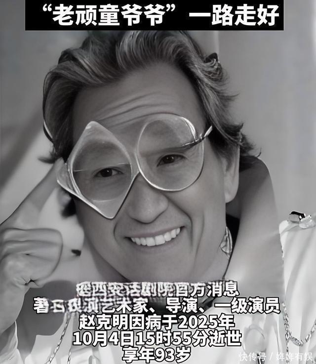 老戏骨赵克明:93载艺术人生,铸就几代人的童年记忆 10月4日,《快乐星球》里那个和蔼可亲的“顽童爷爷”赵克明离世,享年93岁。 这个山西汉子,14岁就失去双亲,却从没被生活打倒,16岁加入陕南党委宣传队,从此与艺术结下不解之缘。 1951年考入西北艺术学院戏剧系,毕业后在西安话剧院一待就是一辈子。话剧舞台上,他能演老能演少,能扮正能扮反,演技堪称一绝。