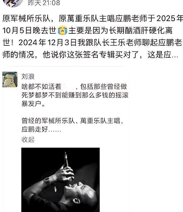 这个土生土长的北京男人,从小就把音乐刻进了骨子里。 20岁加入军械所乐队(后重组为万重乐队)担任主唱,舞台上的他永远像一团燃烧的火,嘶哑的嗓音里带着对摇滚的执着与热爱,成了无数歌迷青春记忆里的高光符号。 谁能想到,舞台下的应鹏却被酒精拖进了深渊。早年婚姻因酗酒破裂后,他彻底放飞自我,整日与酒瓶为伴,肝病悄悄盯上了这个不知节制的灵魂。